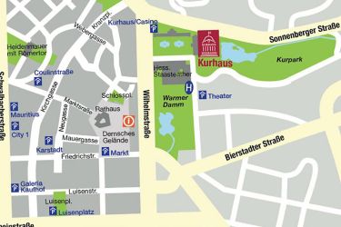 Nur 25 Minuten entfernt vom Frankfurter Flughafen befindet sich Wiesbaden, die Hauptstadt des Bundeslands Hessen. Der zentrale Standort des Kurhauses, direkt neben dem Wiesbadener Staatstheater, erlaubt unseren Veranstaltungsgästen zu Fuß Hotels, Restaurants, Cafés sowie mehrere Museen und Kunstgalerien zu erreichen. Mit dem öffentlichen Nahverkehr sind es vom Hauptbahnhof Wiesbaden fünf Bushaltestellen, circa 1,5 Kilometer und rund 40 min von Frankfurt.